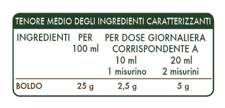Glicerina vegetale bidistillata, acqua pura, boldo (Peumus boldus) foglie.