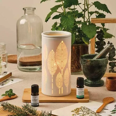 Design con eleganti foglie che ricordano l’alloro impreziosiscono la ceramica traforata dalla quale, una volta acceso il diffusore, si diffondono suggestivi giochi di luce.